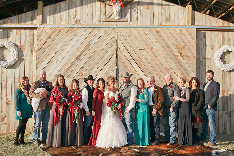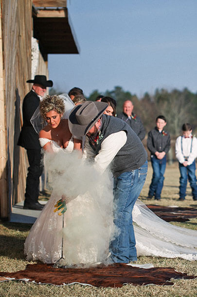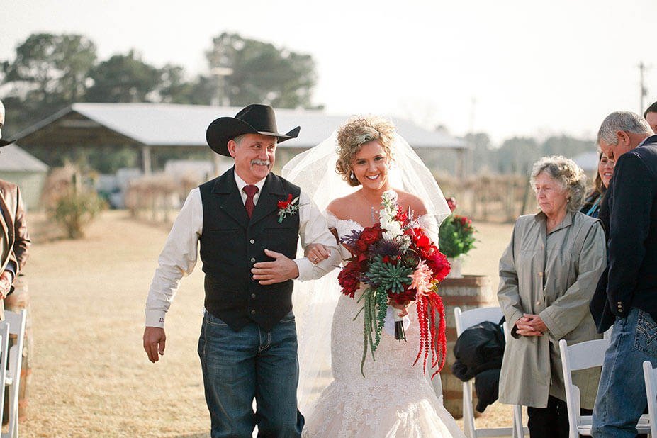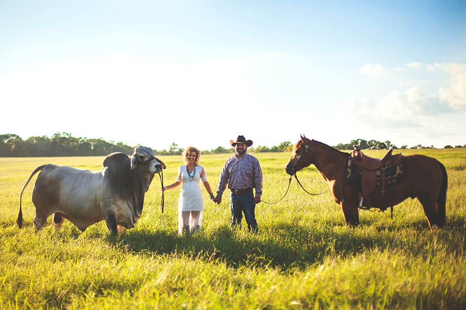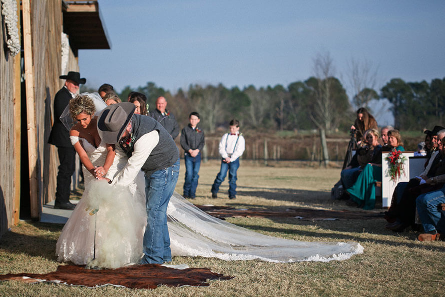 Family ties and farm and ranch roots are very important to both families, and this was reflected in all of the exquisite details of this special day. Briana (formerly Bishop) is a Brahman breeder from Florida. Cole is a Georgia farmer who raises cotton, hay, peanuts, corn, and cattle in Georgia. One highlight of the ceremony included a ranching twist on the unity candle – the unity brand. The Bishop family, Prince family, and Cole and Briana each branded a cowhide with their respective brands. The wedding brought together ranching and farming families from all throughout the southeast to support the new couple in their new life together.